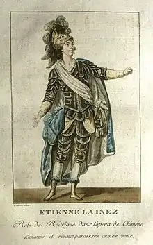Étienne Lainez (or Lainé, Laînez) (23 May 1753 – 15 September 1822) was a French operatic tenor, and leading figure at the Paris Opera for over thirty years. In the course of his career there he created many tenor roles including Rodrigue in Sacchini's Chimène, Énée in Piccinni's Didon, Narcisse in Gluck's Echo et Narcisse, and Licinius in Spontini's La vestale.