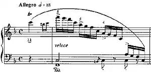 The first section (bars 1–28) features a right-hand figuration that is straightforward with the accent falling always on the first note of each group of four semiquavers throughout the work. The main difficulty is that they must be played forte and legato at speed, ascending and descending sequentially over the keyboard. Due to the obligation to sustain the left-hand melody somehow whilst still keeping the right hand's figure clear, this presents a great difficulty.