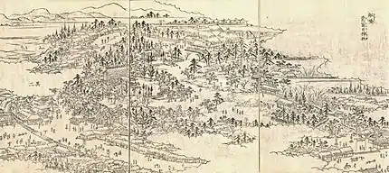 Nichiren, the founder of Nichiren Buddhism, is said to have performed a ritual fast at the shrine and offered a Gohonzon and a sword to it.[1][8] At the beginning of the Edo period, Tokugawa Ieyasu donated land worth fifty koku to the shrine.[1] He is also said to have presented a wooden statue of Yamato Takeru to it in 1608 (Keichō 13). The statue was installed by Ieyasu's son and successor, Hidetada, in a newly-constructed auxiliary shrine in 1622 (Genna 8), in which he also enshrined the deified spirit of his late father. Hidetada himself would later be enshrined there by his son Iemitsu, the third shōgun of the Tokugawa dynasty.[9]