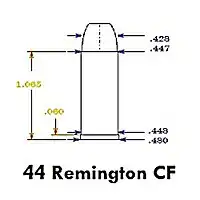 The .44 Remington Centerfire (often referred to as .44 Remington C.F. or .44 Remington) was a centerfire revolver cartridge with a heeled, externally lubricated bullet produced by the Remington Arms Company from 1875 until 1895. Only one weapon, the Remington Model 1875, was chambered for this cartridge.[1]