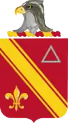 The shield is that of the old 56th Artillery, C.A.C., of which three batteries of the 11th Coast Artillery were a part; Headquarters, A, and C Batteries. The silver triangle was the insignia for the 56th Artillery in France. The fleur-delis was taken from the coat of arms of the old Province of Ile de France, where the regiment first went into action. The crest is taken from the old Coast Defenses of Long Island Sound. The motto translates to "Daring and Vigilant" and is applicable to a Coast Artillery Regiment and is quite symbolic of the fish hawk or osprey, which is a very daring and vigilant bird.
