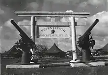 The 17th Defense Battalion landed on Tinian on August 2, 1944. The battalion immediately established anti-aircraft positions north of the airfield and in the harbor. The 17th remained on occupation duty on Tinian for the next year. During this time, it conducted routine patrols and took a number of Japanese prisoners of war remaining on the island after the battle. Three Japanese aircraft bombed and strafed the island on November 3, 1944; however, the battalion's batteries were unable to successfully engage any of the aircraft. The battalion was guarding the airfield on August 6, 1945, when the Enola Gay launched to drop the first ever nuclear weapon against Hiroshima in mainland Japan. On August 15, 1945, the 17th Antiaircraft Artillery Battalion was relieved of its tactical duties on Tinian. It finally departed the island on November 1, 1945, on the USS Griggs (APA-110).[15] The battalion sailed back to the United States and was officially decommissioned on December 6, 1945, at Marine Corps Base Camp Pendleton, California.[2]
