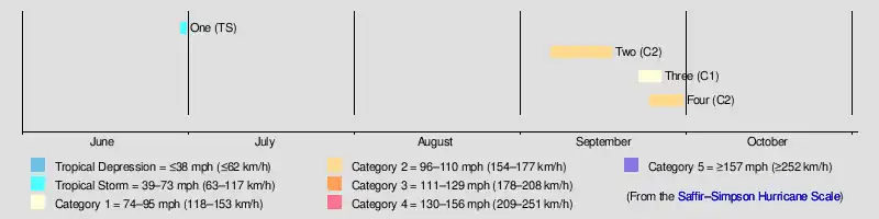 The season's activity was reflected with a low accumulated cyclone energy (ACE) rating of 43. ACE is, broadly speaking, a measure of the power of the hurricane multiplied by the length of time it existed, so storms that last a long time, as well as particularly strong hurricanes, have high ACEs. It is only calculated at six-hour increments in which tropical and subtropical systems are either at or above sustained wind speeds of 39 mph (63 km/h), which is the threshold for tropical storm intensity.[1]