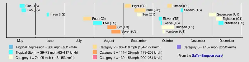 The 1887 Atlantic hurricane season was the most active Atlantic hurricane season on record at the time in terms of number of known tropical storms formed, with 19. This total has since been equaled or surpassed multiple times.[1] The 1887 season featured five off-season storms, with tropical activity occurring as early as May, and as late as December. It is also worthy of note that the volume of recorded activity was documented largely without the benefit of modern technology.[2] Tropical cyclones during this era that did not approach populated areas or shipping lanes, especially if they were relatively weak and of short duration, may have remained undetected. Because technologies such as satellite monitoring were not available until the 1960s, historical data on tropical cyclones from this period may not be comprehensive. An undercount bias of zero to six tropical cyclones per year between 1851 and 1885 and zero to four per year between 1886 and 1910 has been estimated.[3] Of the known 1887 cyclones, Tropical Storm One and Tropical Storm Three were first documented in 1996 by Jose Fernandez-Partagas and Henry Diaz. They also proposed large alterations to the known tracks of several of the other 1887 storms.[4] Later re-analysis led to the known duration of Hurricane Six, and also that of Hurricane Fifteen, being increased.[5]