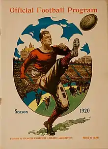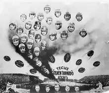 The 1920 Pittsburgh Panthers football team was an American football team that represented the University of Pittsburgh as an independent during the 1920 college football season. In its sixth season under head coach Pop Warner, the team compiled a 6–0–2 record and outscored all opponents by a total of 146 to 44.[1][2] The team played its home games at Forbes Field in Pittsburgh. “Perhaps due to the resurrection of sports after the war period, Pitt enjoyed an athletic year that was quite indicative of its pre-war strength, which so practically dominated college sport activities in this section for many years. The season of 1920-21 boasted of representative Pitt teams in every branch of sport - football, basketball, baseball, track, swimming and tennis. Aviation, which made its initial bow at the University last year, progressed in fine manner – the team having been entered in the big intercollegiate meet.″[3]