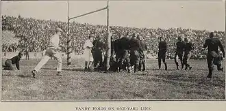 Michigan captain Paul Goebel won the toss and chose the south goal. Vanderbilt decided to kick. Kipke made a first down on the first drive, which started from his own 30-yard line, but Michigan punted the ball away soon after. Vanderbilt kicked back and Michigan punted again after three unsuccessful pass attempts. The best chance to break the tie came early in the first quarter when Vanderbilt was forced to punt from its own 7-yard line.[30] The Wolverines completed their first pass, Doug Roby to Goebel, setting in motion the change in field position which led to their being poised to score inside the 5-yard line.[1] The Commodore punt was partially blocked, giving Michigan the ball at Vanderbilt's 25-yard line. Two end runs, two line bucks, and a forward pass brought them there, first and goal. Some six minutes had gone by at this point.[1] The Commodores' defense stiffened and repelled four attempts at a touchdown. Three runs straight up the middle were stopped before the goal line. Cappon made a yard, Kipke lost one, and Cappon then drove to within a foot of the goal. Vanderbilt captain Jess Neely was heard shouting 'Stop em!'[45][46] On fourth down, Michigan faked a field goal and ran with Harry Kipke off tackle to the right. Kipke was stood up just inches from the end zone.[44][47] One Vanderbilt player even pushed himself off of the goal post, in an attempt to generate a greater backwards push, as the crowd cheered.[22]