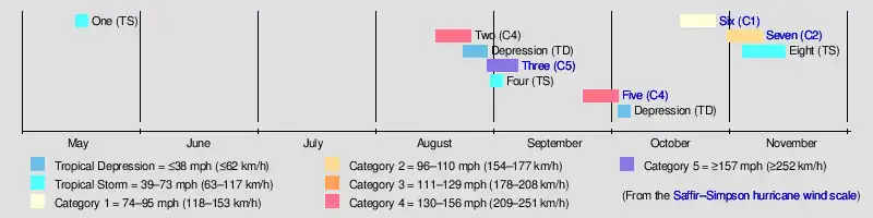 | Seven | October 30 – November 8 | Category 2 hurricane | 105 (165) | 964 | Bahamas, Florida | $5.5 million | 19 | [38] | ||