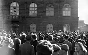 Rocks and eggs were tossed at the building, some breaking the windows and one narrowly missing the head of the Parliamentary president, until the Reykjavík police force, aided by volunteers from the Independence Party intervened, beating rioters down and eventually launching tear gas grenades at the rioters.[1] It was the first time police in Iceland used tear gas against protesters and the only time until 2009, when police used it during the Icelandic financial crisis protests.[2]