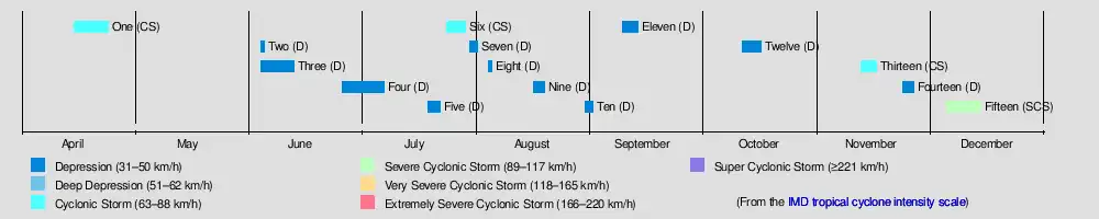 Like in the previous season, most of the storms formed in the season are weak, as four of the fifteen tropical depressions formed intensified to become tropical cyclones. However, unlike the previous season, two severe cyclonic storms formed during the season.[3]