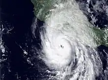 The deadliest and most destructive hurricane of the 1976 season originated as a large tropical disturbance about 525 miles (845 km) southwest of Acapulco, Guerrero, on September 25.[2] It developed into a tropical depression around 18:00 UTC that day and steadily strengthened into Tropical Storm Liza 24 hours later.[3] The incipient cyclone turned toward the north while continuing over warm waters,[2] and it attained hurricane strength by 00:00 UTC on September 28. Liza intensified into a major hurricane on September 29,[3] and a reconnaissance aircraft measured peak winds of 140 mph (230 km/h) around 18:00 UTC, when the storm was in the midst of an eyewall replacement cycle.[2] Liza maintained Category 4 intensity until early on October 1 when it moved ashore the coastline of Mexico north of Los Mochis, Sinaloa, as a slighter weaker Category 3 cyclone. Liza rapidly weakened over the mountainous terrain and was last tracked as a tropical cyclone at 12:00 UTC on October 1.[2][3]