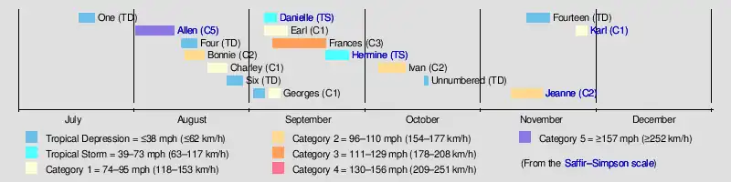 The Atlantic hurricane season officially began on June 1,[1] though the first tropical depression did not develop until July 17. During the season, 16 tropical depressions formed. Eleven of the depressions attained tropical storm status, and nine of these attained hurricane status. Two of the hurricanes further strengthened to become major hurricanes.[2] Only Allen made landfall at hurricane strength during the season, although Hurricane Charley[3] and tropical storms Danielle and Hermine also caused damage and fatalities.[4][5] Those three cyclones collectively caused 316 deaths and $1.57 billion (1980 USD) in damage.[3][5][6][7][8][9][10] The last storm of the season, Hurricane Karl, dissipated on November 27,[4] only three days before the official end date of November 30.[11]
