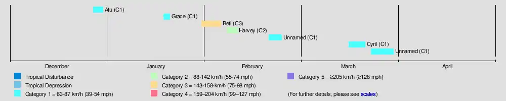 | Atu | December 27–30 | Category 1 tropical cyclone | 85 km/h (50 mph) | 987 hPa (29.15 inHg) | ||||