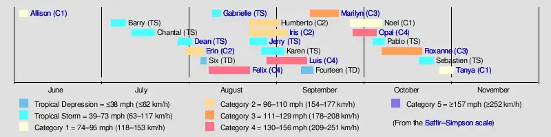 Tropical cyclogenesis in the 1995 Atlantic hurricane season began with the development of Hurricane Allison on June 2. The month of July was very active, with four tropical cyclones forming. This record of storms in July stood until the 2005 Atlantic hurricane season when five storms formed in July. A total of seven storms formed in August — Felix, Gabrielle, Humberto, Iris, Jerry, Karen, and Luis — tying the 1933 record for most in the month; this record was broken in the 2004 Atlantic hurricane season when eight named storms formed during August. Although September is the climatological peak of hurricane season, it was much less active than August. Four tropical cyclones developed in September, with Marilyn, Noel, and Opal eventually strengthening into hurricanes. Four tropical cyclones also formed in October; notably, Hurricane Roxanne developed in that month. The last storm of the season, Hurricane Tanya, developed later in October and eventually became extratropical on November 1.[12]