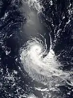 A central dense overcast organized over Helma's center, briefly developing an eye feature on March 11. That day, the MFR estimated peak winds of 110 km/h (70 mph), making Helma a severe tropical storm. The JTWC, which designated the system Tropical Cyclone 17S, upgraded Helma to the equivalent of a minimal hurricane with peak winds of 120 km/h (75 mph). An approaching trough increased wind shear and caused the storm to weaken, leaving the center exposed by late on March 12. After turning to the south, Helma turned back to the southwest as a weakened depression, later turning to the southeast ahead of a cold front. The circulation dissipated on March 16 without affecting land.[2][18]