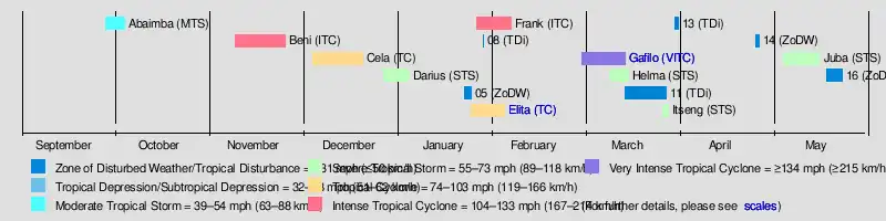 Similar to the preceding season, the 2003–04 season began in September and ended the following May, making it one of the lengthiest on record. Most storms originated near the Chagos Archipelago in the central Indian Ocean.[2] Two storms – Helma and Itseng – crossed from the Australian basin and were tracked by the Bureau of Meteorology (BoM).[4][5] Many of the storms had unusual trajectories, with sudden changes in direction. Cyclone Elita crossed the coastline of Madagascar three times, described by the MFR as an "exotic" track but akin to Cyclone Felicie in 1971. The final storm – Juba – was the third-latest named storm on record, after Ikonjo in May 1990 and Gritelle in June 1991.[2]
