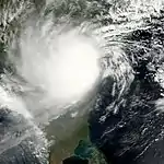 An area of convection formed on October 1 southeast of India. It was located in an area of moderate wind shear. The system moved to the northeast, developing more convection over the circulation. On October 2, the JTWC classified it as Tropical Cyclone 03B, although the IMD never issued warnings on the system. The JTWC estimated peak 1 minute winds of 65 km/h (40 mph). Early on October 3, the storm moved ashore just south of Kolkata, and dissipated soon after.[14] Heavy rains swamped portions of northern Bangladesh causing tremendous flooding that destroyed more than 100,000 mud-built homes. Government officials estimated that 1.5 million people were rendered homeless. Floods also damaged 200,000 hectares (500,000 acres) of crops and 1,000 km (620 mi) of roads. At least 16 people were killed while waterborne diseases in the aftermath threatened to kill dozens more.[26][27][28]