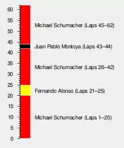 Lap 41 saw Alonso pit for a second time, ahead of Schumacher. Alonso's out lap was not good enough to put himself in front of Schumacher, so their positions remained the same. Alonso chased hard, but a mistake by running wide into a corner left Schumacher a clear path for the last few laps to win. Meanwhile, David Coulthard had a driveshaft problem and retired on lap 47.