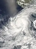 September saw the formation of five systems, excluding Kevin which was named in September but formed on August 31.[24][25] Three systems—Linda, Sixteen-E, and Marty—affected Mexico, with the first two also bringing floods to the Southwestern United States.[26][27][28] The flood event caused by Linda in Utah was also the state's deadliest.[26] October saw another five systems.[29][30] With the formation of Oho on October 3, the 2015 season surpassed 1992 and 1994 as the most active year on record in the Central Pacific.[31] During October 18–19, Olaf became the southernmost-forming hurricane and major hurricane in the Eastern Pacific.[32][33] Olaf later became the first system on record to cross from the Eastern Pacific into the Central Pacific and then back into the Eastern Pacific while still a tropical cyclone.[34] Patricia became the strongest hurricane in the basin on October 23 when its pressure fell to 892 mbar (hPa; 26.34 inHg), breaking the previous record of 902 mbar (hPa; 26.64 inHg) set by 1997's Hurricane Linda.[35] Patricia subsequently became the strongest tropical cyclone on record in the Western Hemisphere in terms of barometric pressure, with a central pressure of 872 mbar (hPa; 25.75 inHg). This value was also the second-lowest globally, behind Typhoon Tip of 1979 which had a central pressure of 870 mbar (hPa; 25.69 inHg). Additionally, its maximum sustained winds of 215 mph (345 km/h) were the strongest ever reliably recorded or estimated anywhere globally.[36] Patricia later became the strongest Pacific hurricane to strike Mexico after making landfall in Jalisco as a strong Category 4 hurricane.[36]