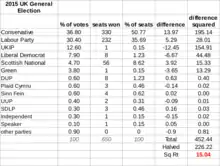 - Scottish National Party (or the SNP): The SNP only contested seats in Scotland and stood in all 59 Scottish constituencies. The party received the second-most votes in Scotland and the sixth-most overall in 2010, winning six seats. It won the 2011 election to the Scottish Parliament and had a surge of support since the Scottish independence referendum in September 2014, in which it was the main political party behind the losing Yes campaign.[35] Most projections suggested that it would be the third-largest party overall after the 2015 election, in terms of seats won, overtaking the Liberal Democrats.[23]