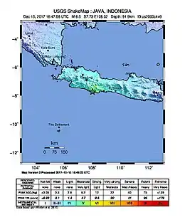The 2017 Java earthquake occurred on 15 December 2017 when a moment magnitude 6.5 earthquake struck the Indonesian island of Java, specifically the city of Tasikmalaya on 23:47:58 West Indonesian Time (16:47:58 UTC) in West Java, Indonesia. The earthquake struck at a depth of 91 km and was categorized as a strong but deep earthquake.[2] It was initially registered as a 7.3 magnitude earthquake by Indonesian agencies. Widespread damage was reported across Tasikmalaya, the nearest major city to the epicentre. A tsunami warning was immediately issued by the authorities but was subsequently cancelled.[3] Four people have been confirmed dead.[4]