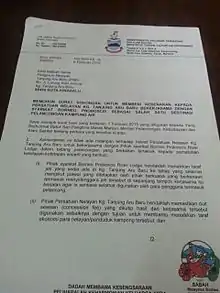 However, this was denied by Tang Yeu, a tour boat operator who has using the jetty for years as he claim to have an approval letter from the Sabah state government to use such jetty.[43] This was also supported by the Tanjung Aru Baru village committee chief leader, Matsah Sahat who expressed a similar view on the issue on which he photograph the approval letter given by the state government as evidence to local media. According to what has been stated on the letter, the villagers in Tanjung Aru had applied for permission to use the jetty from the Sabah State Tourism, Culture and Environment Ministry, with the support of the Agriculture and Food Industries Minister Yahya Hussin, who is also Deputy Chief Minister of Sabah.[43] The letter was signed by the permanent secretary of the State Tourism, Culture and Environment Ministry, Ginun Yangus stating that the ministry had no objections to the villagers use and co-operation with the tour company under several conditions. The village community chief added the tour company pays RM1,000 a month to the committee for the use of the jetty, and employs some 15 locals to work as boatmen and security guards, as stipulated by the agreement.[43] The tour boat operator also denied the claim by Sabah Tourism Assistant Minister that their crews wanted to avoid law and safety regulations as they always comply with the usage of safety vests. In a statement, he said: