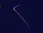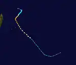 Over the following days, Bouchra fought increasingly unfavorable atmospheric conditions, and underwent a gradual weakening trend.[25] During this time, the cyclone proceeded to track in a slow cyclonic loop just to the west of the border of the Australian region in weak overall steering influences, and was often quasi-stationary.[25] After meandering here for a number of days, the system re-entered the Australian region late on November 12.[26] By this stage, the system had weakened significantly from its peak intensity, and was only at tropical depression strength.[27] The period of residence in the Australian basin proved to be short-lived once again, however, with Météo-France indicating that Ex-Tropical Storm Bouchra had returned to the far eastern part of their area of responsibility early on November 13.[26] In the early hours of November 14, the Australian Bureau of Meteorology noted that the system had crossed back into the Australian region basin.[28] However, on November 17, Bouchra crossed back over into the South-West Indian Ocean basin, as the storm began taking a southwestward trajectory.