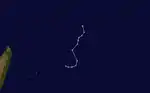 The origin of Calvinia can be traced back to an area of persistent showers and thunderstorms southwest of Diego Garcia first noted by the JTWC on 16 December. The system featured a loosely-defined circulation upon designation, but computer models indicated that tropical cyclogenesis intermediately was unlikely.[64] The storm complex drifted southward over the next two days,[65] and an increase in organisation briefly prompted the issuance of a Tropical Cyclone Formation Alert (TCFA) on 18 December before an increase in wind shear cut development of the system short, leading to alert's cancellation despite the system producing storm-force winds.[66][67] The system then slowly curved to the west towards Madagascar,[68][69] eventually moving into a much more favorable environment enhanced by a passing Kelvin wave by 25 December.[70][71] Two days later, MFR designated the system as a Zone of Disturbed Weather;[72] the disturbance was initially broad and had two areas of rotation.[73] The next day, MFR upgraded the system to a Tropical Depression while the JTWC issued a second TCFA.[72][74] Tracking southward, the depression strengthened and became a Moderate Tropical Storm on 29 December, gaining the name Calvinia.[75][76]