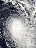 Dry air and wind shear afflicted the nascent storm early in its development, limiting convection to the southern half of Calvinia's circulation.[76][77] The storm remained asymmetric but showed signs of improvement on 29 December as the environment became more favourable for intensification, with rainbands redeveloping near the center of the storm. Concurrently, Calvinia turned towards the southwest and slowed down as it neared Mauritius.[78] The next morning, a small eye emerged within the quasi-stationary Calvinia on radar imagery from the Mascarene Islands, allowing the MFR to upgrade Calvinia to a Severe Tropical Storm that day.[79] The eye was later evident on satellite imagery, indicative of continued intensification.[80] After the eye had collapsed yet again, an area of high pressure to Calvinia's southeast then began to steer the storm slowly towards the south and away from the Mascarene Islands on 30 December.[81] Shortly after it began to track away from Mauritius, the storm intensified further into a Category 1 hurricane-equivalent storm and another eye began to appear on satellite imagery on 31 December. Shortly after, the MFR also upgraded Calvinia to a tropical cyclone.[82] Not too long after intensifying, the storm accelerated southwestwards and significantly weakened on 1 January. As a result, the MFR issued their final advisory on the system as it turned extratropical.[83]