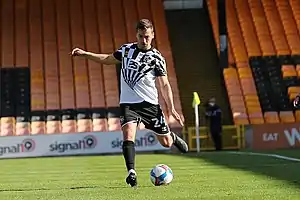 The new year began with a 4–0 defeat at Mansfield Town thanks to a Jordan Bowery hat-trick and Legge being sent off for the second time of the season; speaking in his post-match interview, Askey alluded to "a lot of strange happenings going", saying that "it’s not a level playing field at the moment".[42] This proved to be Askey's last game in charge and he left the club on 4 January, with coach Danny Pugh stepping in as caretaker manager.[1] Pugh made Conlon the new club captain.[43] Pugh selected a 4–4–2 formation for first game in charge, a 3–0 home win over Grimsby Town that proved to be a stark contrast to their defeat seven days previously.[44] The club then signed Jake Taylor, a 22-year old midfielder who had impressed on loan from Nottingham Forest the previous season, to a three-and-a-half-year deal.[45] With Pope ruled out injured for the rest of the season, the club also brought in striker Kurtis Guthrie after he secured his release from Bradford City.[46] In order to comply with EFL squad limit rules the club deregistered Harry McKirdy and Theo Robinson so as to make room for the two new signings.[47] Guthrie started on the bench at Forest Green Rovers on 16 January, which ended as a 1–1 draw following a late equalising goal from Rodney.[48] However, two days later, Pugh had to start self-isolation after testing positive for COVID-19; his assistants – Frank Sinclair, Billy Paynter and Anthony Griffith took over first-team duties in his absence.[49] They oversaw a 3–1 defeat to Walsall in which Brown played poorly and allowed a weak back-pass to bobble over his foot and into the back of the net.[50] The bad run continued at Scunthorpe, as poor defending allowed a brace from Ryan Loft to condemn Vale to a 2–0 loss;[51] stand-in manager Frank Sinclair said that "it wasn’t good enough, especially the first half".[52] Pugh returned to the touchline in time to oversee a 5–1 victory over bottom-club Southend United, who Pope described as "the worst professional side I have ever seen".[53][54] On transfer deadline day the club signed 19-year old centre-back Mustapha Olagunju on loan from Huddersfield Town and 20-year old striker Will Swan on loan from Nottingham Forest.[55][56]