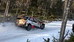 As championship leaders, Neuville and Gilsoul became the first crew on the road in Sweden.[93] This saw them struggle throughout the weekend as their road position meant they swept loose gravel away from the faster road base underneath, which was further complicated by the rally being shortened due to a lack of snow.[11] The rally was eventually won by Evans and Martin. They dominated the rally, winning five stages out of nine, to take victory; Evans' second and a first for Martin.[94] They then led both drivers' and co-drivers' standings for the first time in their careers.[95] Their teammate Kalle Rovanperä recorded his first stage win at the sport's highest level when he and co-driver Jonne Halttunen won the Power Stage. Rovanperä and Halttunen also achieved their maiden podium finish.[96] At the age of nineteen, Rovanperä became the youngest driver ever to claim a WRC podium finish.[96]