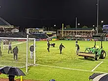 The grounds crew works to repair the sod infield during a weather delay due to poor field conditions at Isotopes Park for the New Mexico United vs. LA Galaxy II match on 5 October 2022