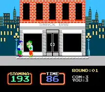 Each punch costs the player 1 HP. Flower pots are occasionally dropped from windows, which will cost a fighter 5 HP and daze the fighter if they hit. When a player is knocked off the pavement, they advance to the next street. After every third fight, the opponent is knocked into a manhole, then the player has a brief celebration where a lady throws confetti from a window. The goal of the game is to reach the rank of Champion. Every three fights won, the player gets a specific symbol on the lower right corner; after five symbols are earned, they go to the next set of symbols. After 45 symbols (135 fights), they get the rank of Champion. In addition, a police car may pass by the fighting at any point in the fight which causes the players to return to their starting positions. If the timer runs out, the police will arrest the player closest to being knocked off of the pavement, meaning it is a default win for the other player for that round.