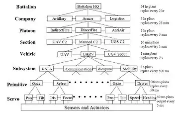 4D/RCS prescribes a hierarchical control principle that decomposed high level commands into actions that employ physical actuators and sensors. The figure for example shows a high level block diagram of a 4D/RCS reference model architecture for a notional Future Combat System (FCS) battalion. Commands flow down the hierarchy, and status feedback and sensory information flows up. Large amounts of communication may occur between nodes at the same level, particularly within the same subtree of the command tree:[5]