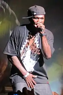 American rapper 50 Cent has released five studio albums, ten mixtapes, two video albums, four compilation albums, two soundtrack album, 76 singles (including 26 as a featured artist), and 88 music videos. As of July 2014, he is the sixth best-selling hip-hop artist of the Nielsen SoundScan era with 16,786,000 albums sold in the US.[1][2] 50 Cent signed to Shady Records in 2002 and released his debut studio album, Get Rich or Die Tryin', on February 6, 2003.[3] The album peaked at number one in the US Billboard 200 and performed well in international markets.[4][5][6] It features the number-one singles "In da Club" and "21 Questions"[7] and also includes the singles "P.I.M.P." and "If I Can't". 50 Cent collaborated with American rapper Lil' Kim on "Magic Stick", which peaked at number two in the US.