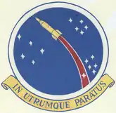 - ↑ Approved 25 April 1962. Description: On an Air Force blue disc within a wide white border, fimbriated Air Force blue, an Air Force golden yellow missile in upward flight leaving a red trail arched to sinister base, fimbriated white; all between three groups of white lozenge-shaped stars, five in dexter, five in sinister chief, and six in sinister base (one of these last appearing in the misssile's trail).