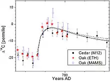 The carbon-14 spike around 774. Colored dots are measurements in Japanese (M12) and German (oak) trees; black lines are the modeled profile corresponding to the instant production of carbon-14.[2]