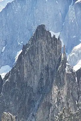 The Aiguille de la Brenva (3,269 metres (10,725 ft)) is a remote rocky mountain peak in the Mont Blanc massif of the Alps. It lies wholly within Italy on a ridge descending south-east from the Tour Ronde. It has been described as "a spectacular fin with a fine E face".[2] It stands on a ridge separating the Entrèves glacier from the Brenva glacier, yet is somewhat overshadowed by its larger neighbours, such as the Aiguille Blanche and the Aiguille Noire de Peuterey. Nevertheless, it is a distinctive peak, offering a number of very challenging climbs, especially on its east face which consists of vertical granite flakes and cracks. On its northern side stands a distinctive, slender rock pinnacle about 60 metres high, known as the Père Eternel.[3]