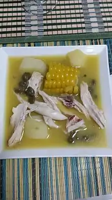 Ajiaco (Spanish pronunciation: [aˈxjako]) is a soup common to Colombia, Cuba,[1] and Peru.[2] Scholars have debated the origin of the dish. The dish is especially popular in the Colombian capital, Bogotá, being called Ajiaco santafereño, where it is typically made with chicken, three varieties of potatoes, and the herb Galinsoga parviflora, known locally as guasca or guascas. In Cuba, ajiaco is prepared as a stew, while in Peru the dish is prepared with a number of regionally specific variations.
