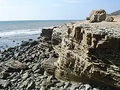 In 1987, construction work was done on the College Boulevard near Carlsbad at the Californian coast. While paleontologically surveying the work, Bradford Riney noted that a skeleton had been uncovered by a ditch dug for a sewage pipe. Within days, the specimen was secured by the San Diego Natural History Museum. It was dubbed the "Carlsbad Ankylosaur".[1] The skeleton was later described, but not named, in 1996 by Thomas Deméré and Walter Preston Coombs before being named in 2001 by Tracy Lee Ford and James Kirkland.[1][2] The skeleton originated from a layer of the marine Point Loma Formation which dates to the upper Campanian stage, 75.5 Ma. The formation has yielded specimens pertaining to calcareous nannoplankton, foraminifers, scaphopods, pelecypods, gastropods, cephalopods, ostracods, decapods, echinoids, elasmobranchs, and actinopterygians, with the addition of a femur, right dentary containing teeth and cervical vertebrae of a hadrosaur.[1][3] The type and only known specimen of Aletopelta was once a bloated carcass that had been washed out to sea, likely by a stream, which sank to the bottom with its underside facing upwards and became a miniature reef, as evidence by Pelecypoda such as Ostrea sp. and Spondylus sp. being attached to the bones and the presence of ammonites and gastropods found in association with the skeleton. The carcass was also scavenged upon by marine invertebrates and sharks such as Squalicorax and Scapanorhynchus, which resulted with most of the long bones being hollow and many shallow pits on the osteoderms and ribs.[1] The holotype specimen, SDNHM 33909, consists of teeth, fragmentary scapulae, partial humerus, partial ulna, possible fragment of right radius, ulna, partial left and possibly right ischium, femora, tibiae, fibulae, four or five partial vertebrae, dorsal neural arch, neural arches of the sacrum, fragmentary ribs, osteoderms including pelvic shield and cervical half ring. The type specimen may represent an immature individual based on the unfused astragalus, partly fused scutes and unfused neural spines.[2]