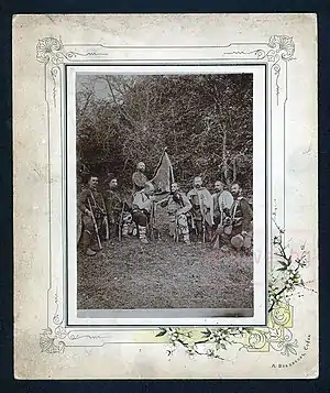 Foreign correspondents Alfred Hales and Boris L. Tageev in Ivan Tsonchev's band during the Ilinden–Preobrazhenie Uprising, 1903. Tsonchev is holdind the flag, Hales is kissing it, Tageev is under the flag
