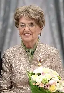 She has been decorated 33 times throughout her career.[3] In 1962, Aksyonova received the VDNKh Silver Medal,[7] the Order of the Badge of Honour in 1971 and the Order of the Red Banner of Labour in 1976.[2] She was decorated with the State Prize of the RSFSR in the field of architecture "for the restoration of historical and cultural monuments of the cities of Vladimir and Suzdal, the creation of museum expositions and their widespread use for cultural, educational and tourist purposes" in 1977.[2] Aksyonova was made a Honoured Cultural Worker of the RSFSR on 26 May 1980 "for services in the field of Soviet culture",[9] and the Order of Friendship of Peoples in 1986.[2]