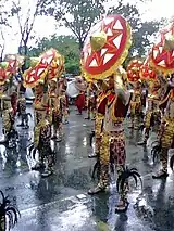 Aliwan Fiesta is divided into three categories: Cultural Street Dance Competition (the main event), Float Parade, and Reyna ng Aliwan (Queen of Entertainment/Amusement) competition. Each of the country's 17 regions have the option to send up to two contingents representing its respective cultural festival, as well as an option to send a representing float and or Reyna ng Aliwan contestant.[4] However, the roster of entries for the cultural dance and float competitions are limited. In 2008, the number of slots for cultural dance was increased from 20 to 24 groups, which was completed as early as January.[3] Each contingent in the cultural street dance competition—totaling up to 100 dancers as well as hundreds of musicians and support staff members—have undergone stringent elimination cycles during various local festivals before being chosen to compete in Aliwan Fiesta.[1] The highlight of the event is when all competing festivals show off their dance skills while parading for four kilometers (about 2+12 miles) along Roxas Boulevard from Quirino Grandstand to Aliw Theater grounds located near CCP.[5] The festivals range from the well-known such as Dinagyang of Iloilo City, Sinulog of Cebu City, and Panagbenga of Baguio, to the obscure but just-as-interesting feasts like Alikaraw of Hilongos, Leyte, Padang-Padang of Parang, Shariff Kabunsuan, and Pamitinan Festival of Rodriguez, Rizal.[1] Side events also include a bazaar featuring different regional products, a photography contest, an inter-scholastic dance competition (interpreting dance tunes played on MBC radio stations), Filipino street games, and a fireworks display.[5][6]