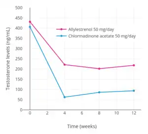 Similarly to other progestogens, allylestrenol has potent antigonadotropic effects.[54] It is able to considerably decrease circulating concentrations of luteinizing hormone, testosterone, and dihydrotestosterone in men.[32][34][39][40] At a dosage of 50 mg/day, allylestrenol has been found to suppress circulating testosterone levels by 78% in men with BPH.[54] This is about the maximum that progestogens are known to be able to suppress testosterone levels in men.[55][56][57] In accordance, the reduction of testosterone and luteinizing hormone levels with allylestrenol in men has been found in a study to be equivalent to that of chlormadinone acetate and oxendolone.[33] However, another study found a significantly lower decrease in testosterone levels with 50 mg/day allylestrenol relative to 50 mg/day chlormadinone acetate of about 49–52% versus 76–85%, respectively.[34] Animal research suggests that allylestrenol produces its beneficial effects in BPH via its antigonadotropic effects and consequent suppression of androgen levels and inhibition of prostate gland growth, similarly to other progestins.[54] Some studies have found that allylestrenol is less effective for BPH than chlormadinone acetate but also produces fewer side effects and sexual dysfunction.[31][34][35] Allylestrenol therapy for BPH is associated with a significant decrease in prostate-specific antigen levels, which may mask the detection of prostate cancer.[54][43]