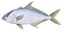 The longfin yellowtail (Seriola rivoliana),[2] also known as the almaco or silvercoat jack, deep-water, falcate, European or highfin amberjack, rock salmon, longfin or yellow kingfish, is a game fish of the family Carangidae; they are in the same family as yellowtail and amberjack.[3] They are carnivorous and feed, both day and night, on other, smaller fish, such as baitfish, small squid, octopus, crab and shrimp.[4] The flesh is thick and dense, like tuna, and easily may be passed off for white albacore if prepared as sushi.[3]