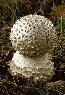 Amanita echinocephala is a large, whitish or ivory-coloured mushroom with a characteristic spiny, or warty-looking cap. A. solitaria is a synonym and opinions are divided as to which name takes precedence. It lives on chalky soils with beech trees, and appears earlier than most mushrooms of similar size in southern England. It frequently occurs singly or in small groups, resulting in it being referred to as the solitary amanita or, more specifically, European solitary lepidella. It is very drought-tolerant.