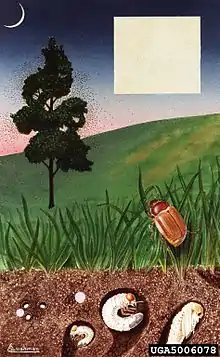 Female chafers lay 20-40 eggs over their lifespan. They are laid singly, 5–10 centimetres (2–4 in) deep in moist soil, and take 2 weeks to hatch. The grubs hatch by late July. The grub population consists mainly of first instars in early- to mid-August, second instars by early September, and third instars by mid-September to early October. In frost zones, the grubs feed until November, then move deeper into the soil. In frost-free areas, the larva will feed all winter. Vigorous feeding occurs from March through May. In early June, the grubs again move deeper, from 5–25 centimetres (2–10 in), to form earthen cells and pupate. The pre-pupal and pupal stages last 2–4 days and 2 weeks, respectively. By June, the new beetles begin emerging.