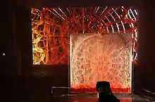 A 2013 exhibition by Molodkin in the Void Gallery in Derry entitled 'Catholic Blood' was created specifically for the context of Derry and Northern Ireland. 'Catholic Blood' tapped into contentious historical divides in Ireland, as its subject is based in the Catholic Relief Act of 1829 and a particular clause of the British constitution that reportedly forbids any MP from advising the sovereign on ecclesiastical matters if they are of the Catholic faith, though this was disputed by Dr Bob Morris, an expert in constitutional affairs at University College London. Molodkin correctly asserted, "Yes, but there have been no Catholic prime ministers, perhaps when we talk about it we will get one."[10][11][12] The work was controversial in its choice of materials which consisted of blood donated by local Catholics, a specification that was met with resistance.[13] The project required the participation of the public, thirty-six people came forward to donate their blood, including the son of a Catholic Priest.[13] The piece was constructed from hollowed acrylic blocks, mirroring the rose window of the Palace of Westminster.[11][13] A pharmaceutical fridge contained samples of donated human blood and an industrial compressor pumped this blood through the cavity of the rose window in the acrylic block. This was simultaneously filmed and projected onto the gallery walls.