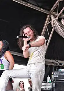 W.K.'s major-label debut studio album, I Get Wet, was released on November 13, 2001, on Island Records.[21][22] Continuing the sound established by his previous Bulb Records EPs, I Get Wet is characterized by its metal and punk rock influences and lyrical content revolving around partying.[2] The album is known for its cover art, a photograph by Roe Ethridge of Andrew W.K. with a stream of blood running from his nose onto his chin and neck,[23] which generated minor controversy in Europe after it was seen to represent cocaine abuse;[24] W.K. achieved the effect by striking himself in the face with a cinderblock during the photo shoot, and subsequently supplementing his own blood with some of an animal obtained from a butcher's shop.[8]