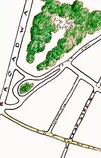 Ann Street is one of the oldest streets in New York City, appearing on a map created in 1728. Ann Street was named after Ann White, the wife of a developer and merchant, Capt. Thomas White. She may have urged him to name the street after her because other merchants' wives already had streets named after them.[1] The street is relatively small and short compared with the other lower Manhattan streets named after merchants' wives.