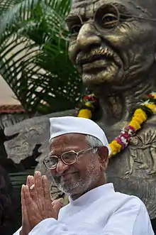 Kisan Baburao "Anna" Hazare (ⓘ; born 15 June 1937) is an Indian social activist who led movements to promote rural development, increase government transparency, and investigate and punish corruption in public life. In addition to organising and encouraging grassroots movements, Hazare frequently conducted hunger strikes to further his causes—a tactic reminiscent, to many, of the work of Mahatma Gandhi.[1][2] Hazare also contributed to the development and structuring of Ralegan Siddhi, a village in Parner taluka of Ahmednagar district, Maharashtra, India. He was awarded the Padma Bhushan—the third-highest civilian award—by the Government of India in 1992 for his efforts in establishing this village as a model for others.[3]